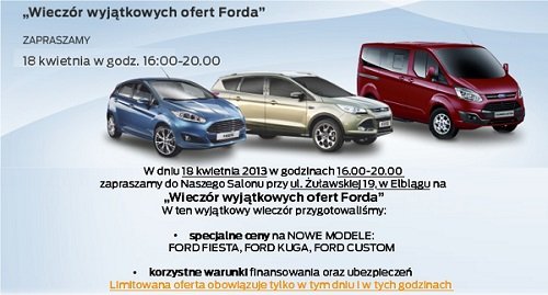 Chcąc przedstawić wszystkie możliwości i innowacyjne zastosowania w nowych modelach Forda, Gołębiewski Autoryzowany Dealer Forda organizuje w swoim salonie „Wieczór wyjątkowych ofert Forda”, który odbędzie się w czwartek (18 kwietnia) w godz. 16 - 20 w Elblągu przy ul. Żuławskiej 19.