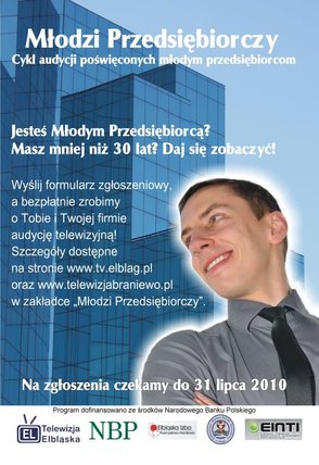 Młodzi Przedsiębiorczy to nowy cykl audycji realizowanych przez Telewizję Elbląską, a dofinansowanych ze środków Narodowego Banku Polskiego. Programy mają na celu ukazanie, jak radzą sobie na rynku firmy prowadzone przez przedsiębiorców, którzy nie ukończyli 30. roku życia.