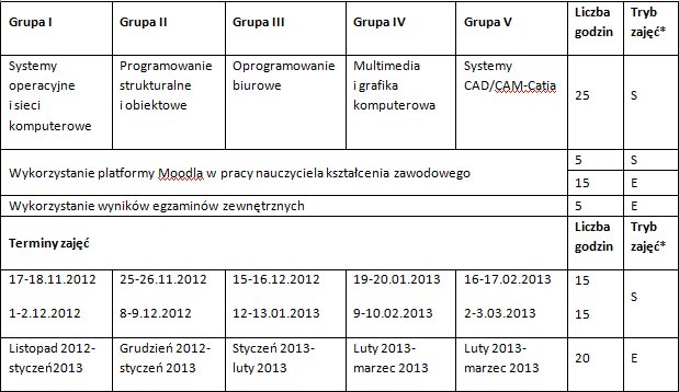 Zapraszamy 60 nauczycieli przedmiotów zawodowych z powiatów: bartoszyckiego, braniewskiego, działdowskiego, elbląskiego, Elbląg grodzki, iławskiego, lidzbarskiego, nowomiejskiego, ostródzkiego, którzy mają kwalifikacje do nauczania w zawodzie technik informatyk, technik mechanik, technik mechatronik, technik elektronik, technik administracji, technik prac biurowych do udziału w bezpłatnym kursie „Zawodowiec informatyczny fachowiec”, który będzie realizowany od 1.11.2012r. do 31.03.2013r. w ramach Działania 9.4 Wysoko wykwalifikowane kadry systemu oświaty Programu Operacyjnego Kapitał Ludzki.