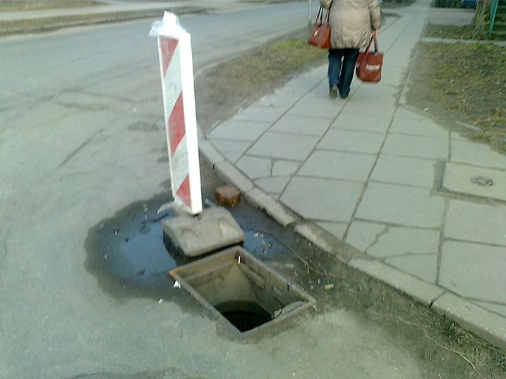 Obok dziur przechodzą ludzie: starsi, młodsi, dzieci. Ktoś zajrzy, ktoś wrzuci w otwór wypełniony wodą jakieś śmieci, dla dzieci to atrakcja. Przejeżdżają tutaj często samochody policyjne, zapewne również straży miejskiej i innych służb, dzięki którym czujemy się w mieście bezpiecznie i pewnie. Pewnie przechodzą tutaj nasi radni, którzy przecież śledzą to, co się dzieje wśród ludzi, którzy ich wybrali.