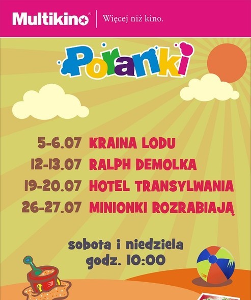W lipcu br. w każdą sobotę i niedzielę Multikino zaprasza wszystkie dzieci powyżej 5 roku życia na Poranki w Multikinie. W najbliższą niedzielę o godz. 10 dzieci zobaczą film „Minionki rozrabiają”. Bilet w cenie 12 zł.