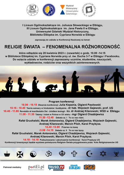 „Religie świata – fenomenalna różnorodność” to temat, który podejmą uczestnicy konferencji organizowanej przez I Liceum Ogólnokształcące im. Juliusza Słowackiego w Elblągu, III Liceum Ogólnokształcące im. Jana Pawła II w Elblągu oraz Wydział Historyczny Uniwersytetu Gdańskiego. Gospodarzem konferencji będzie Biblioteka Elbląska im. Cypriana Norwida, a do udziału zapraszamy uczniów, studentów, nauczycieli, rodziców, wyznawców różnych religii oraz wszystkich zainteresowanych.