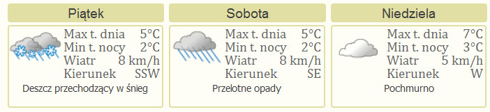 Pogoda w ten weekend będzie listopadowa. W piątek śnieg z deszczem, w sobotę deszcz, w niedzielę bez deszczu, ale za to pochmurnie. Temperatura będzie wahać się od 5 do 7 stopni.