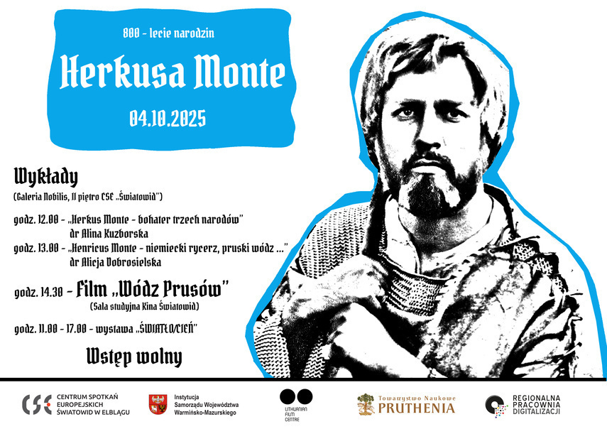 W 2025 r. obchodzimy 800-lecie narodzin Herkusa Monte - legendarnego wodza pruskiego plemienia Natangów w czasach największego pruskiego powstania antykrzyżackiego w latach 1260 - 1274. Podobnie jak szkocki bohater narodowy William Wallace, Herkus Monte walczył z silniejszym przeciwnikiem o to, by jego lud mógł zachować wolność i własne obyczaje. Stał się symbolem oporu przeciwko krzyżackiej chrystianizacji mieczem, a jego imię przetrwało nie tylko w legendach, ale stało się inspiracją dla pisarzy i artystów, w tym m.in. dla Adama Mickiewicza. Centrum Spotka Europejskich „Światowid" w Elblągu zaprasza w sobotę, 4 października na wykłady i projekcję filmu poświęconych historii tej barwnej postaci. Wstęp wolny.
