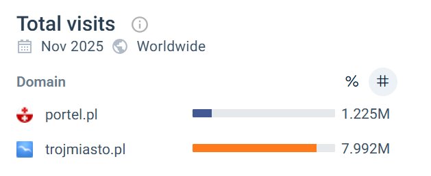 Trzeba być niespełna rozumu, żeby odbierać Trojmiasto. pl palmę pierwszeństwa wśród portali regionalnych. Proszę jednak pamiętać, że aglomeracja trójmiejska liczy około 800 tysięcy mieszkańców, czyli prawie 8 razy więcej niż Elbląg. Proszę zgadnąć ile razy więcej wizyt wg similarweb ma trojmiasto. pl w stosunku do portElu? Uważam, że nie mamy się czego wstydzić :)