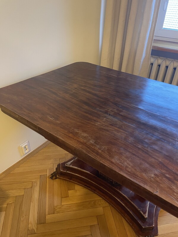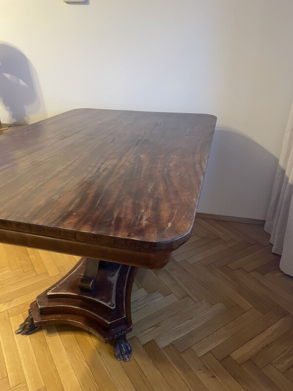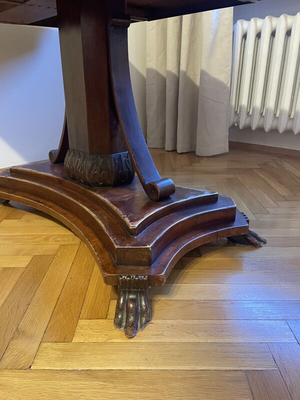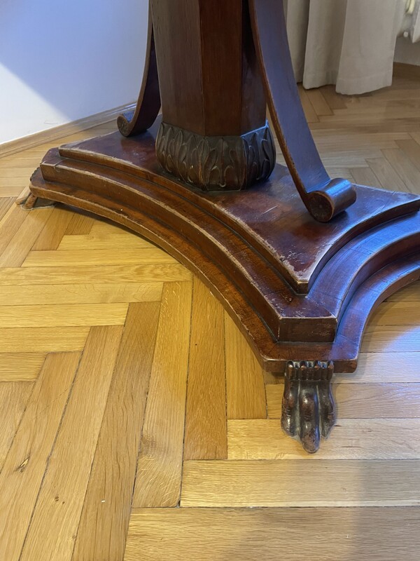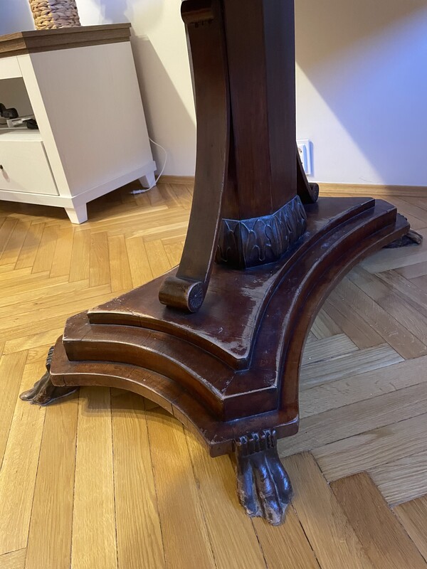 Autentyczny, stary stół z przełomu XIX i XX wieku, w stylistyce klasycystycznej / empire na centralnej kolumnie. Cztery dekoracyjne lwie łapy.