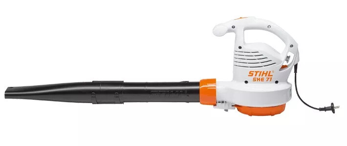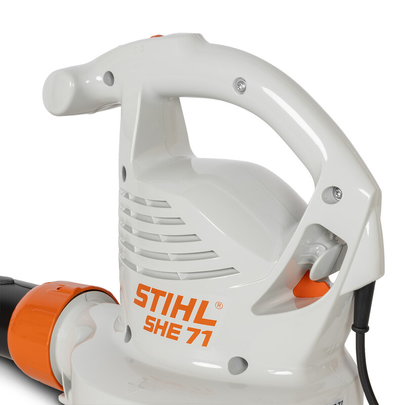 STIHL SHE 71, który łączy funkcjonalność odkurzacza i dmuchawy w jednym lekkim, cichym urządzeniu elektrycznym.