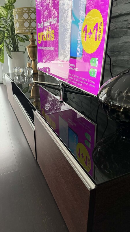 1.Stylowy szafka RTV z przeszklonym ciemnym blatem. Idealna do przechowywania sprzętu elektronicznego lub dekoracji. Posiada 3 szuflady wysuwane i po środku wnękę na sprzęt. Wymiary: długość: 218cm, szerokość:56cm wysokość:38cm. Jest małe uszkodzenie szkła widoczne na zdjęciu. CENA: 300zł