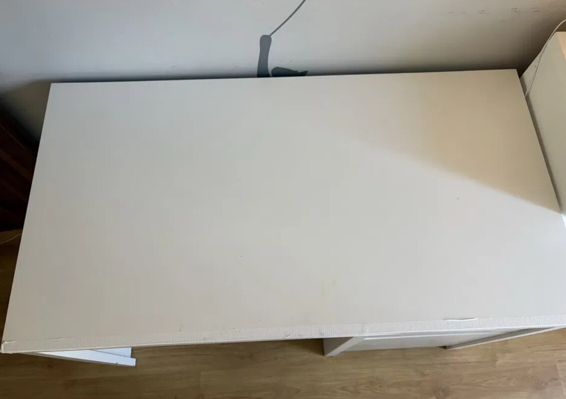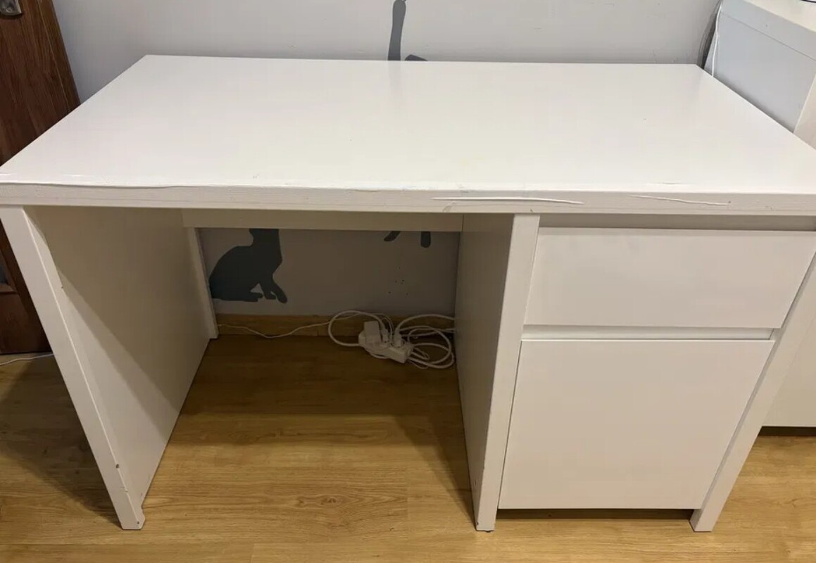 Sprzedam duże biurko Kaspian z black red white biały połysk + krzesło Ikea. Biurko ma powycieraną okleinę z przodu blatu (zabezpieczone biała taśma) oraz posiada normalne śladu użytkowania. krzesło 2 letnie. Cena nowego takiego zestawu to około 900zl. Transport we własnym zakresie. Wymiary biurka to 120cm dł 65 głębokość oraz 75 wysokość. Cena do negocjacji.