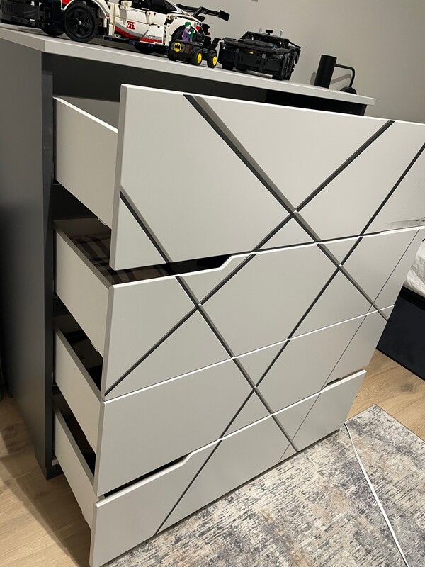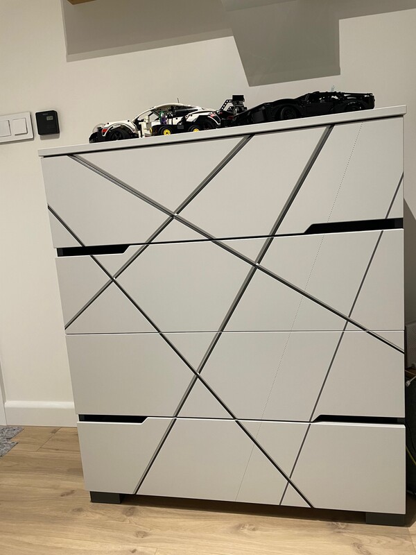 Grawerowane, malowane, szare fronty z liniowymi aplikacjami. Korpus z antracytowej laminowanej płyty.