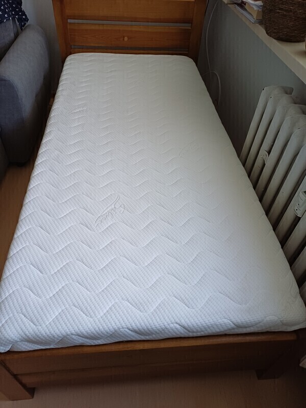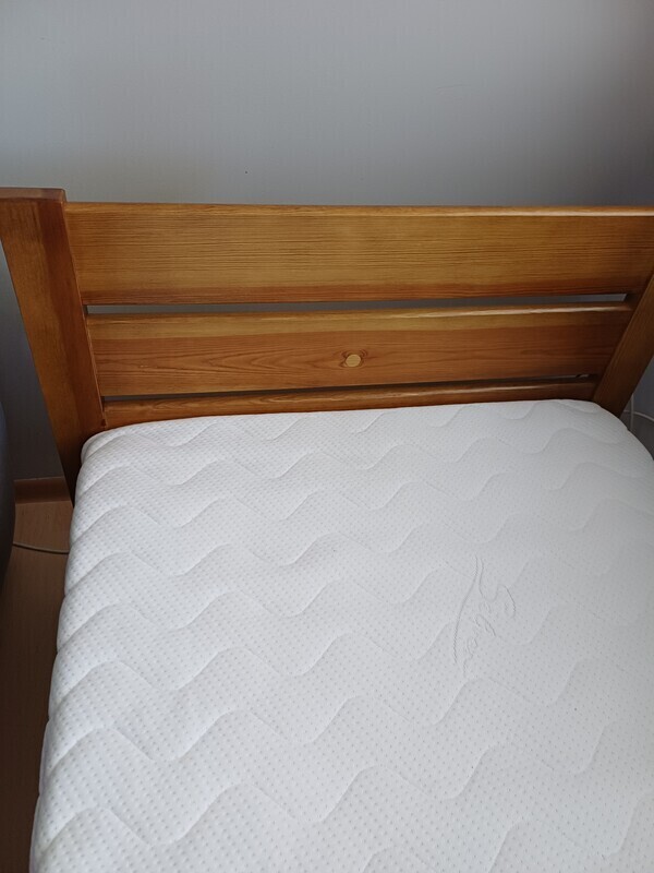 łóżko oraz materac kupione w Elbląskich materacach przy ul. Grunwaldzkiej. Stan idealny. Szerokość materaca 90 cm, szerokość ramy łóżka 100 cm, wysokość materaca 20 cm, wysokość od podłogi do powierzchni materaca ok 50 cm, wysokość drewnianego zagłówka 85 cm