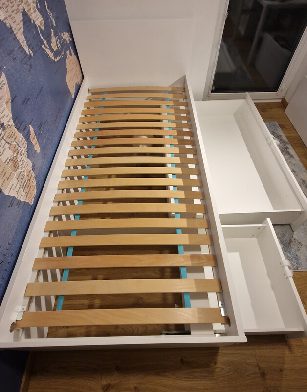 Sprzedam białe łóżko firmy Meblik pod materac 90x200 – w komplecie elastyczny stelaż bukowy oraz 2 praktyczne szuflady Twin Meblik.