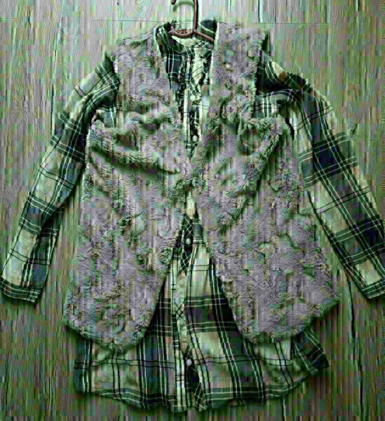Koszula, dłuższa koszula, sukienka koszulowa i kamizelka, bezrękawnik- mieciusieńki, puszysty. Koszula zapinana na guziczki, bezrękawnik na haftki. Super fajny zestaw.