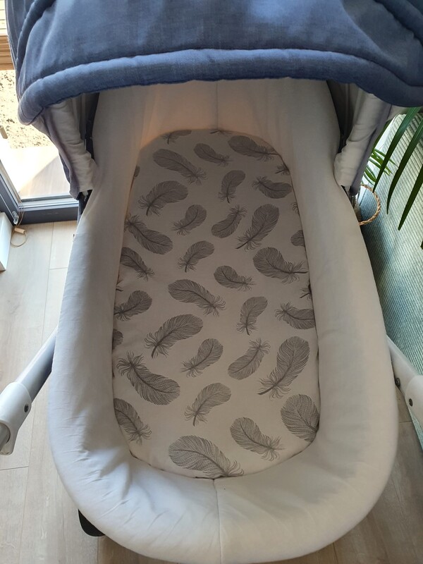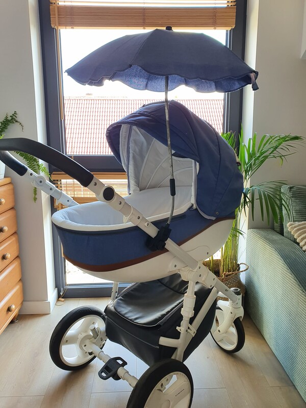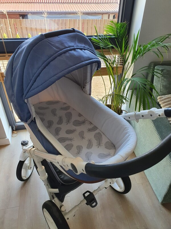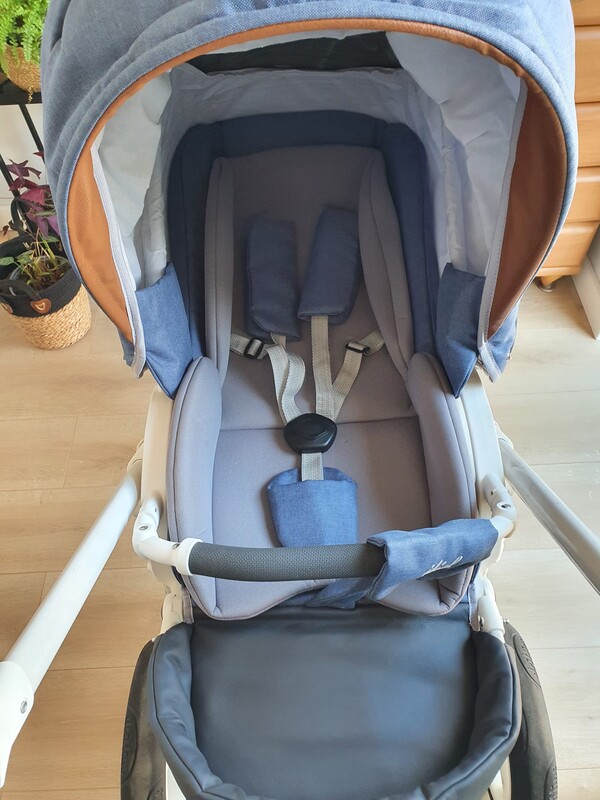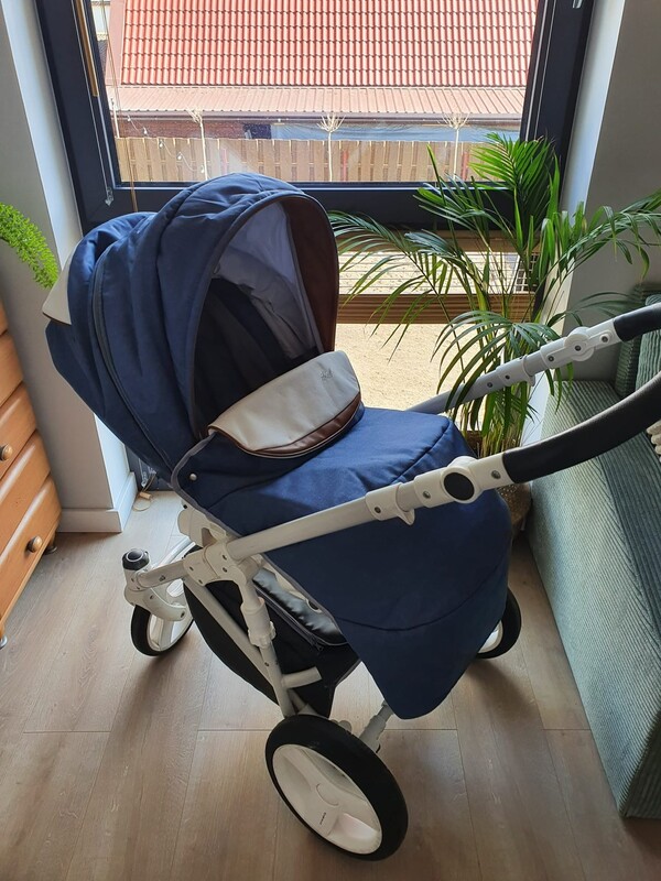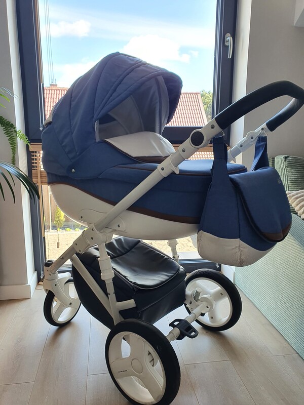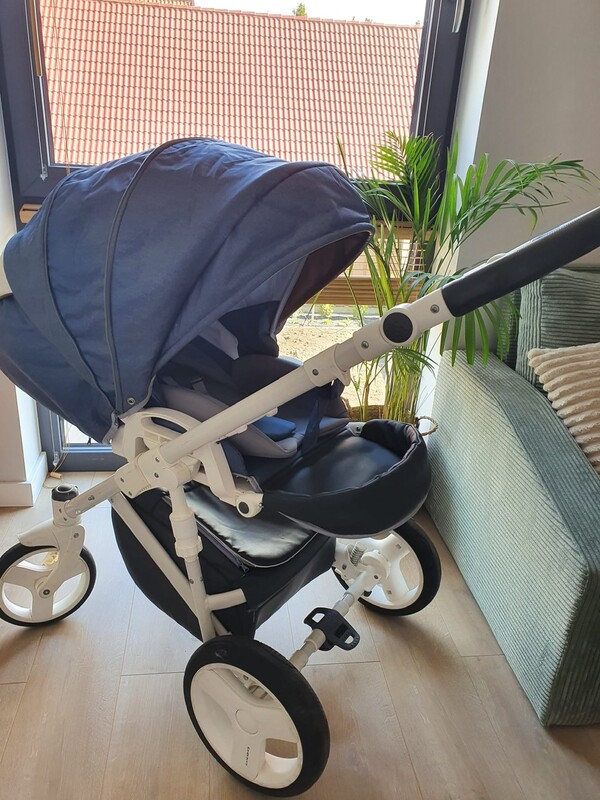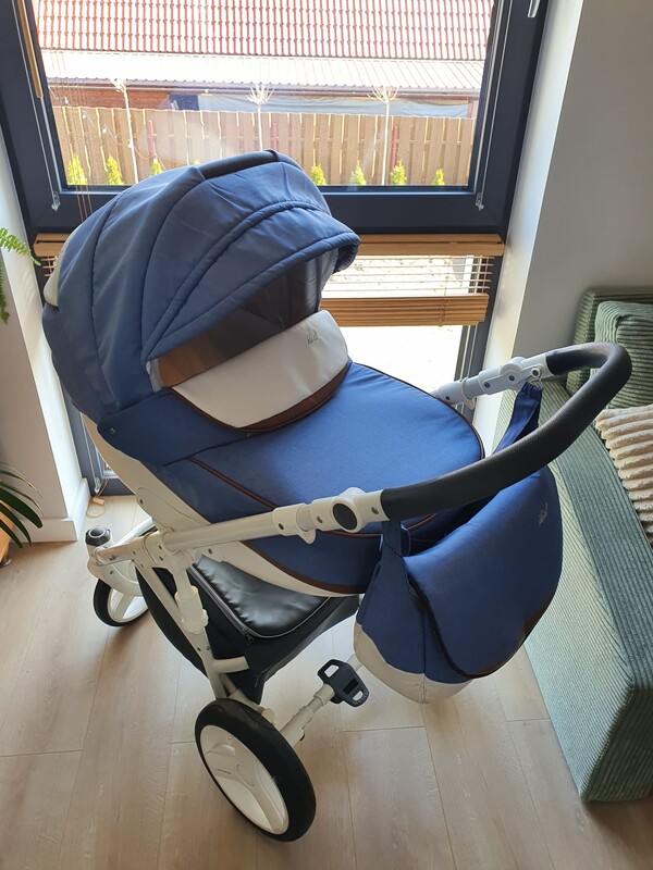 Zestaw 2w1 składa się z aluminiowego stelaża z amortyzatorem i żelowymi kołami, gondoli oraz spacerówki. W wózku jest materacyk z wkładem z kokosa.