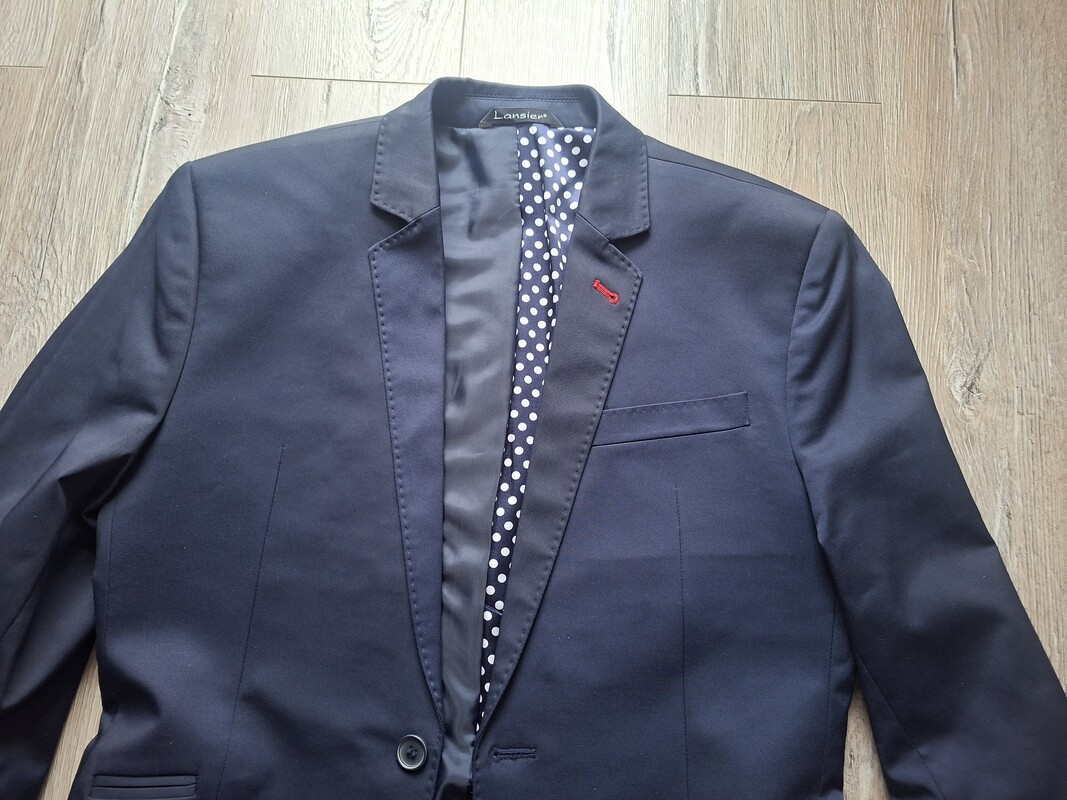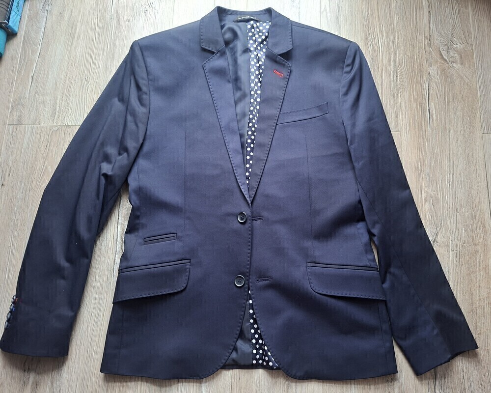 Sprzedam ubraną 2 razy marynarkę. Syn szybko wyrósł. Piękny, ciemny granat. Aparat trochę rozjaśnia.
