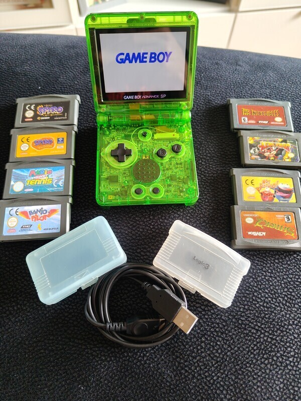 Cztery oryginalne gry (rząd ze spyro) i 4ry zamienniki(chyba wymagaja wymiany baterii) W zestawie z kablem do ładowania i 2ma etui na dyskietki.