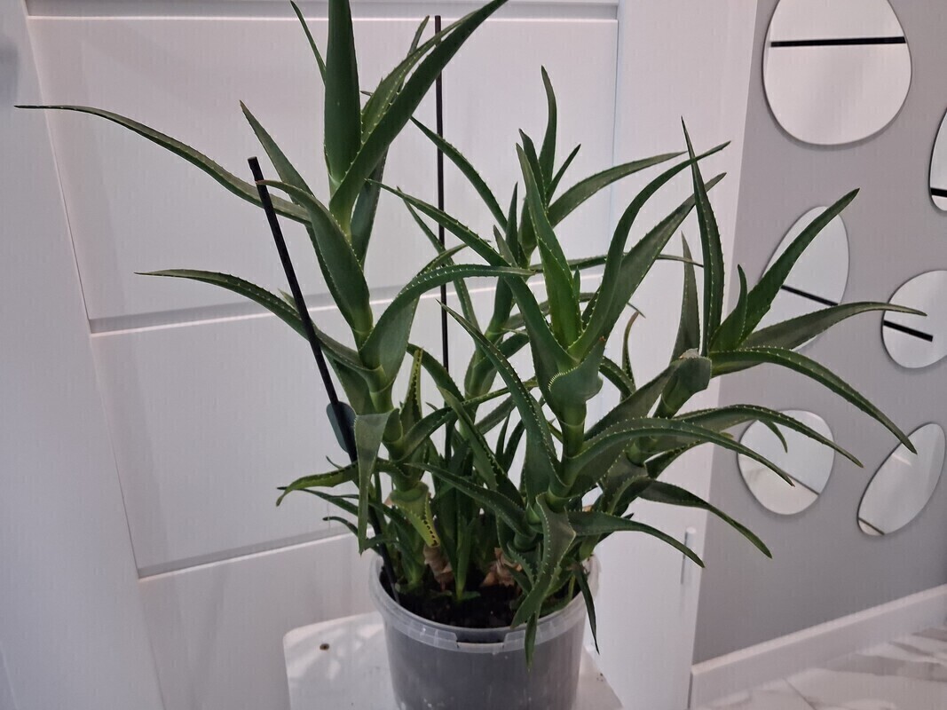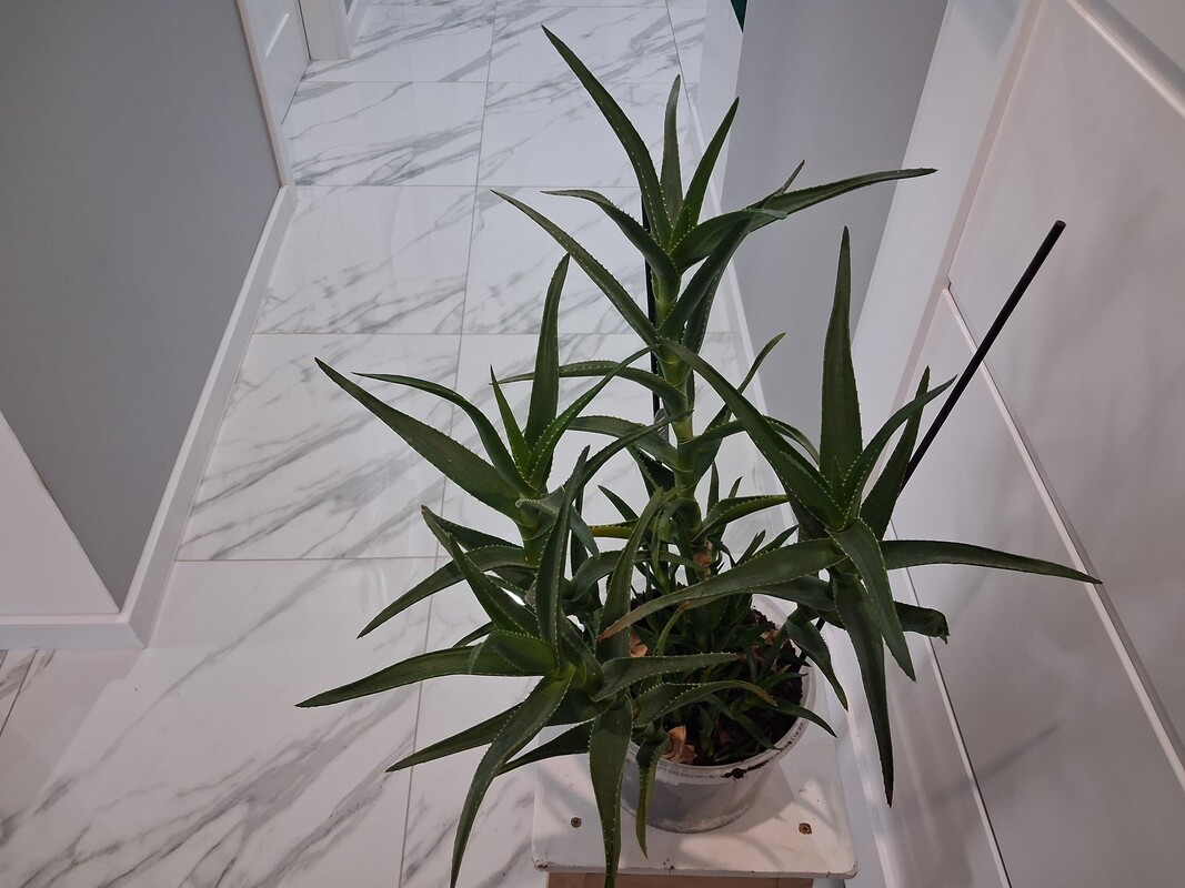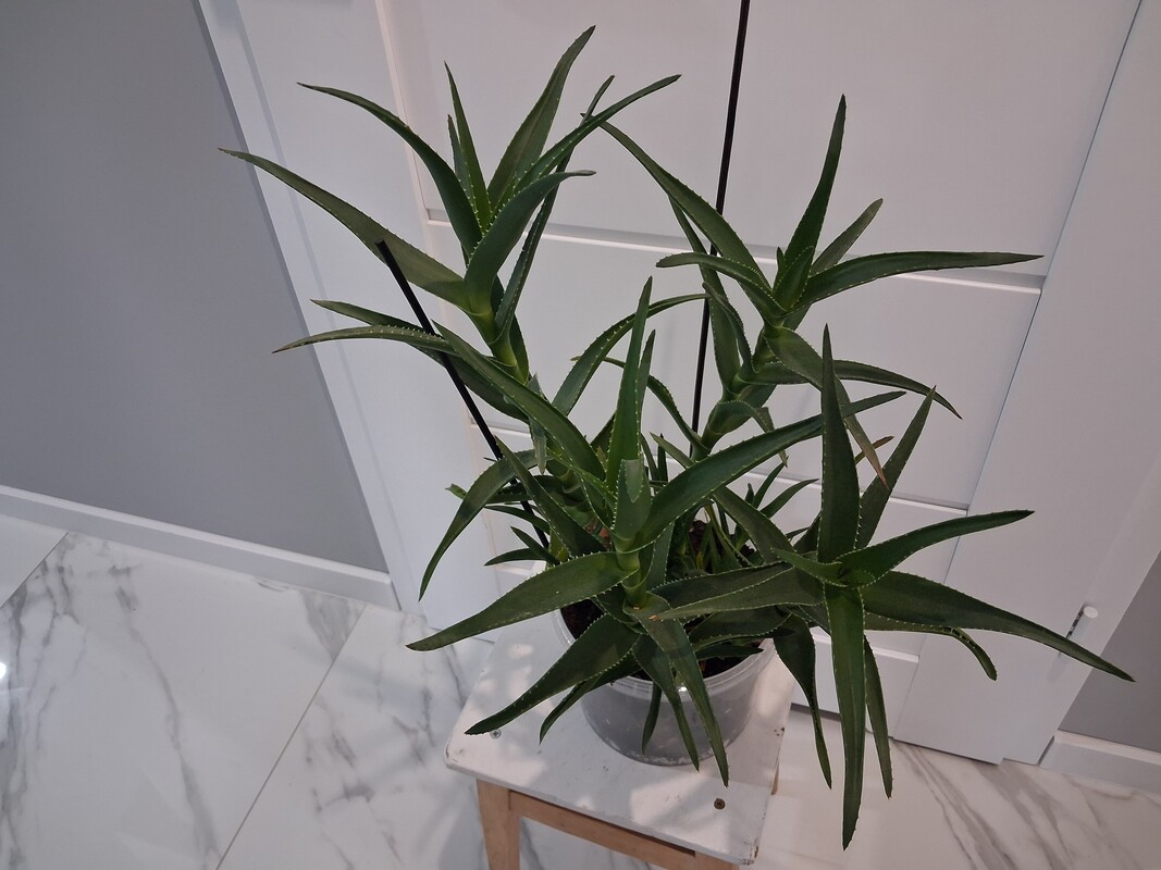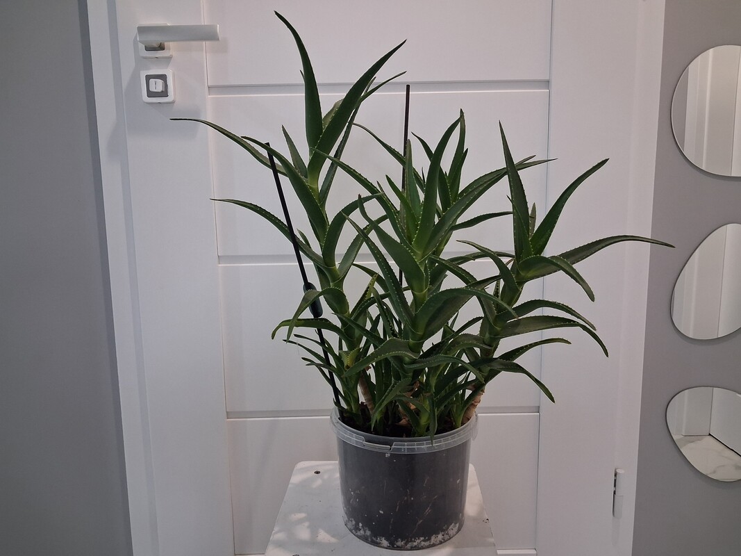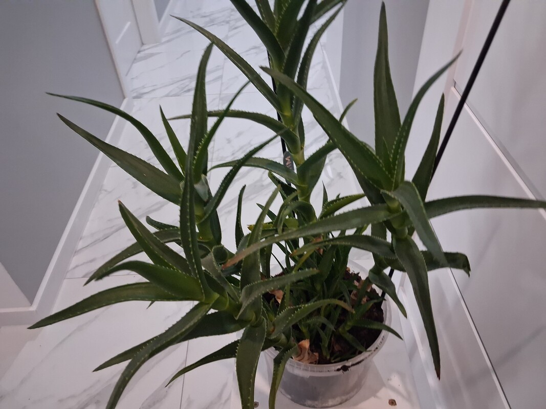Świeża, zdrowa roślina aloesu drzewiastego w doniczce. Aloes to popularna roślina doniczkowa, która łatwo się pielęgnuje i oczyszcza powietrze w pomieszczeniach. Liście aloesu mają charakterystyczny, wydłużony kształt i soczysty, zielony kolor. Roślina ta doskonale sprawdzi się jako dekoracja w domu lub biurze.