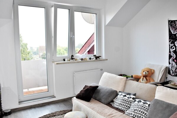 Do pokoju o charakterze salonu przylega nieduży balkon.