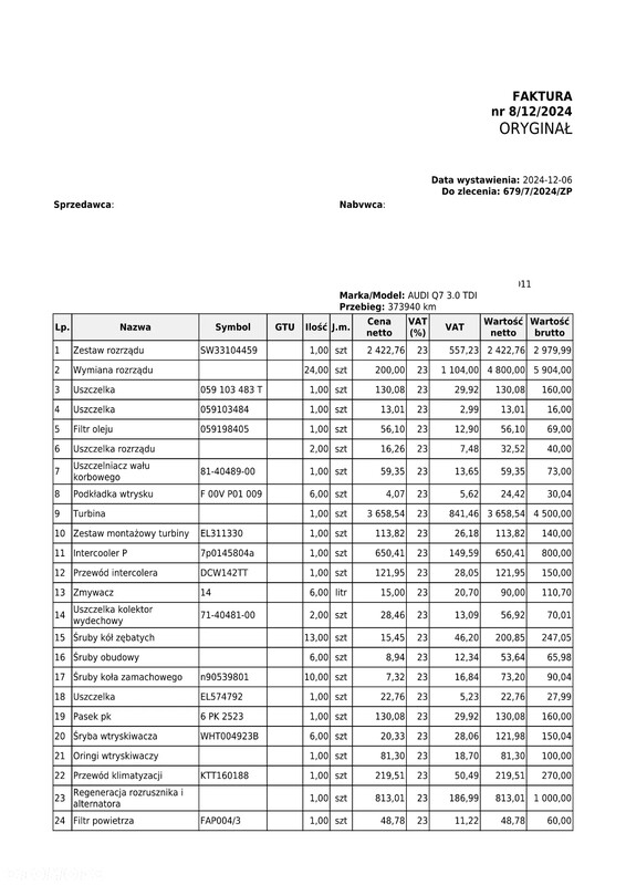 Ostatni większy serwis wykonany na kwotę ponad 21 tyś. zł, podczas którego wymieniony został m. in. kompletny rozrząd, intercooler, turbina, akumulator, a przy tym zregenerowany został rozrusznik i alternator oraz wykonany został kompleksowy serwis klimatyzacji (szczegóły na załączonej fakturze). Ostatni serwis olejowy zrobiony na świeżo w październiku 2025r. (przy przebiegu ok. 386tys km). W trakcie eksploatacji wymieniane były również miechy zawieszenia pneumatycznego (całkowicie nowe). Wszystkie serwisy i naprawy udokumentowane i do zweryfikowania w zakładzie mechanicznym, w którym w większości wykonywane były naprawy. W 2024r. auto przeszło gruntowne odświeżenie w zakresie regeneracji lakieru oraz skóry wewnątrz auta. Serwis olejowy wykonywany regularnie - maksymalnie co 12 miesięcy. W moich rękach auto w ciągu roku wykonuje ok 15-20 tyś km rocznie, także nie jest katowane.