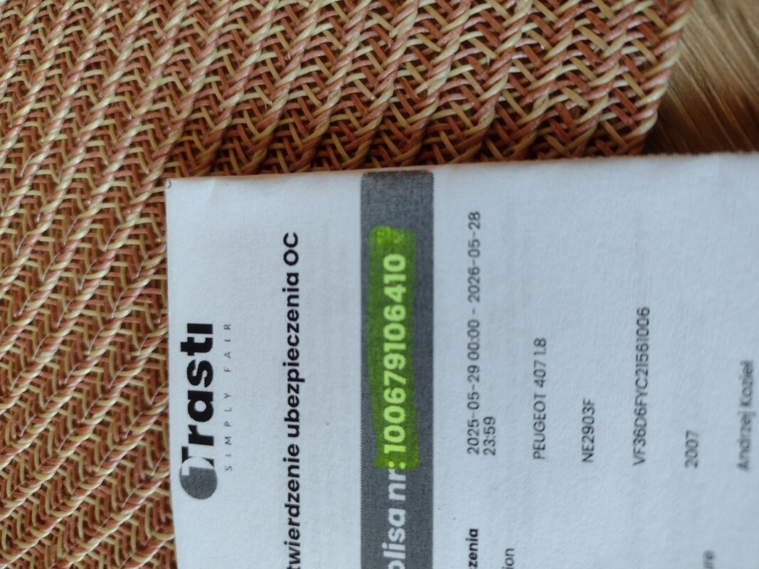 Sprzedam samochód osobowy Peugeot 407 2007r.1.8 benzyna 125KM (ANGLIK). Skrzynia biegów manualna. Auto od 7 lat w Polsce użytkowane przez tego samego właściciela. Aktualny przebieg ok 184 000 km. Opony letnie i zimowe kupowane jako nowe 2 lata temu. Auto obecnie na oponach letnich. Auto z aktualnymi badaniami technicznymi (do 19.03.2026) i ubezpieczeniem (28.05.2026). Auto w pełni sprawne. Wyrażam zgodę na oględziny na dowolnej stacji diagnostycznej.