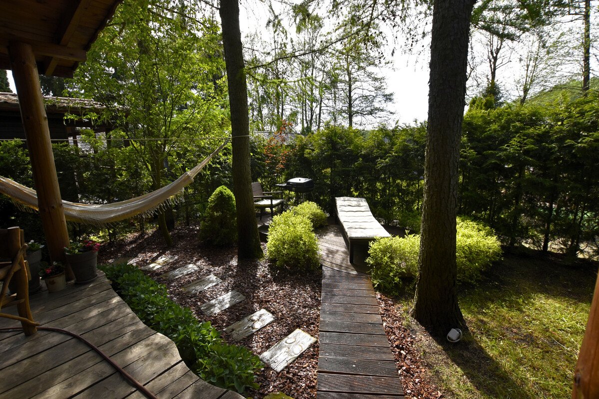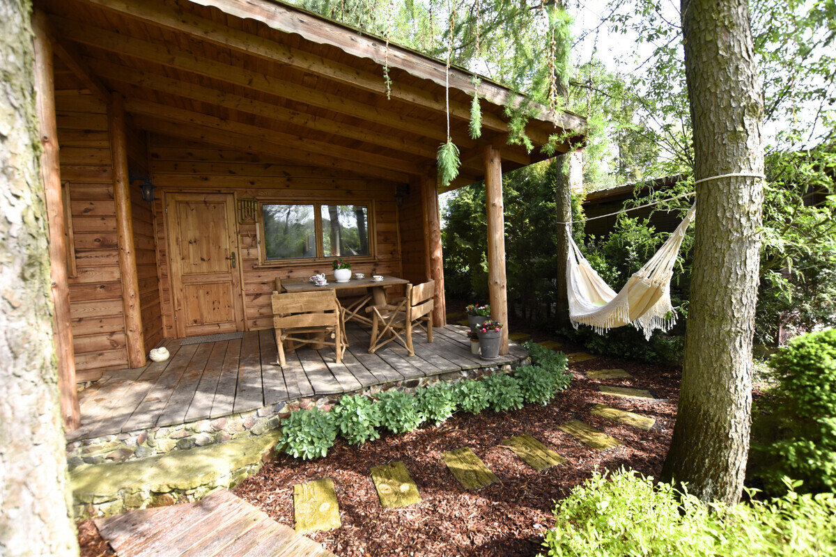 Zadbana działka, otoczona zielenią – z miejscem na ognisko, leżaki, hamak.