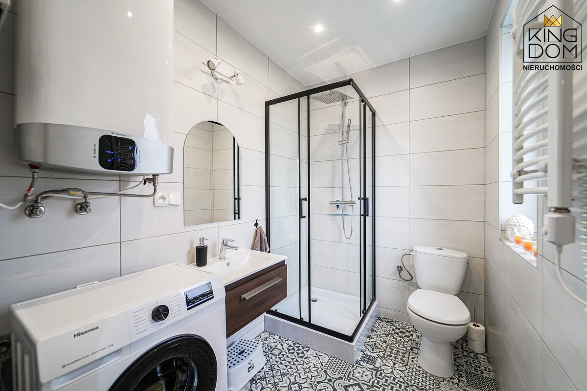 - łazienka z kabiną prysznicową, wc oraz pralką,