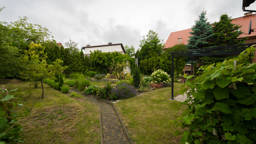 Ogród zagospodarowany. Nasadzenie krzewów na granicy działki powoduje, że nie widać sąsiada. Idealne miejsce do wypoczynku w otoczeniu zieleni. Podjazd utwardzony z kostki brukowej.