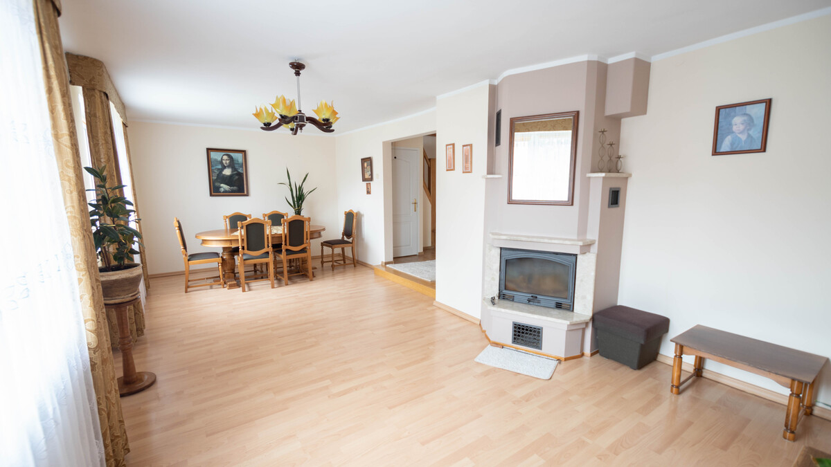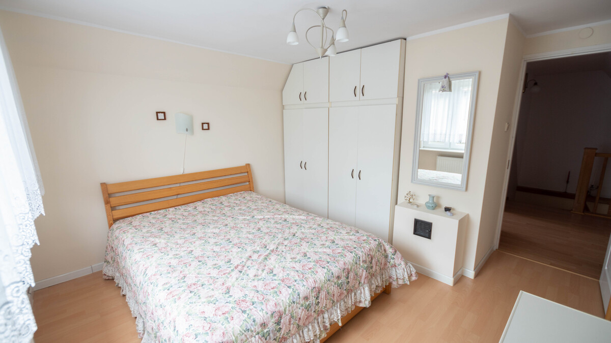 Dom jest jednopiętrowy, podpiwniczony, z garażem wolnostojącym na działce. Na parterze znajduje się duży, słoneczny salon z wystawą południową, przestronna kuchnia, łazienka z WC oraz przedpokój z wejściem do piwnicy i schodami prowadzącymi na piętro. Na pierwszym piętrze znajdują się dwa ustawne pokoje, idealne do urządzenia sypialni, gabinetu czy pokoju dziecięcego.