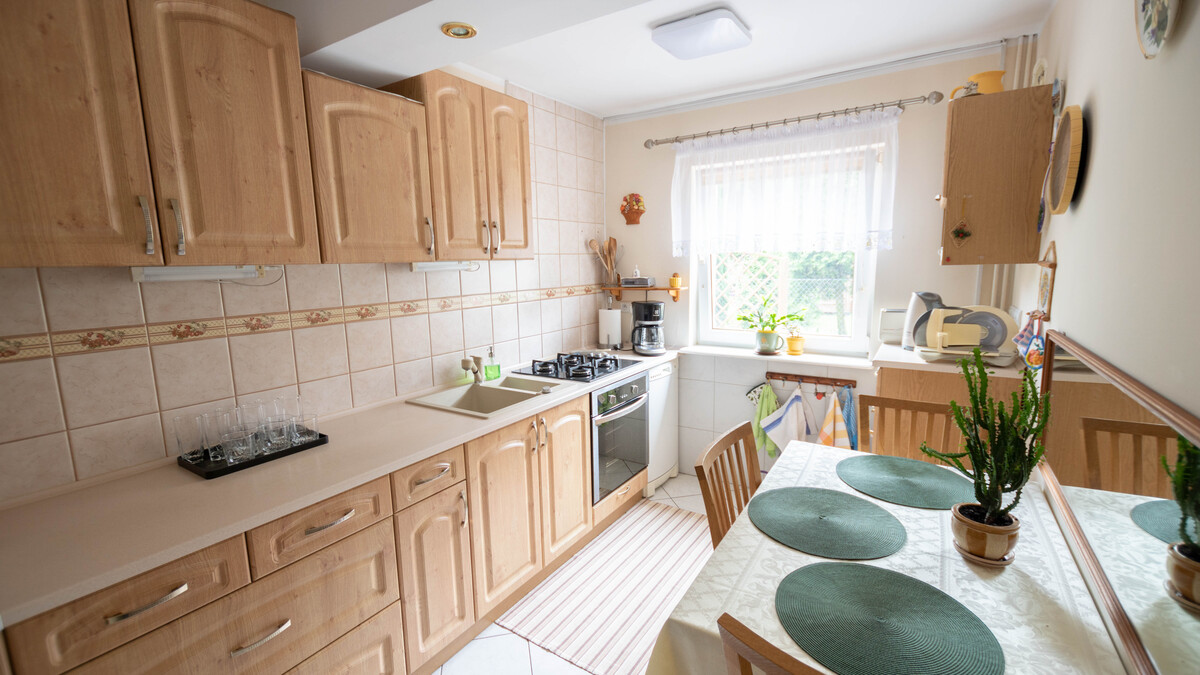 Okna PCV z wystawą na wschód i południe zapewniają dużo naturalnego światła i przyjemną atmosferę. Ogrzewanie i ciepła woda pochodzą z sieci miejskiej, co gwarantuje komfort użytkowania.