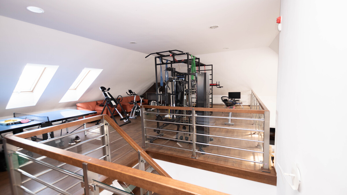 Na poddaszu zaprojektowano otwartą przestrzeń do dowolnej aranżacji, pokój oraz garderobę, co daje dużą swobodę w dopasowaniu przestrzeni do własnych potrzeb. Obecnie właściciel zagospodarował tą część na siłownie.