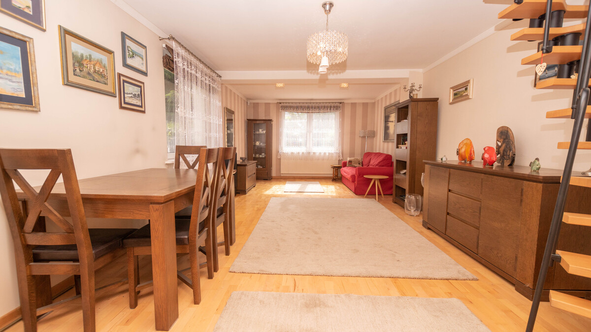 Dom w 2004 roku został rozbudowany i zyskał funkcjonalną, przestronną aranżację wnętrz. Na parterze znajduje się duży, jasny salon z częścią wypoczynkową i jadalnią, kuchnia z wyjściem do pięknej oranżerii, łazienka z WC oraz przedpokój.