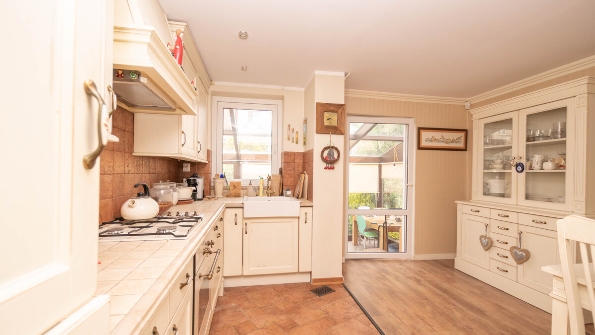 Dom w 2004 roku został rozbudowany i zyskał funkcjonalną, przestronną aranżację wnętrz. Na parterze znajduje się duży, jasny salon z częścią wypoczynkową i jadalnią, kuchnia z wyjściem do pięknej oranżerii, łazienka z WC oraz przedpokój.