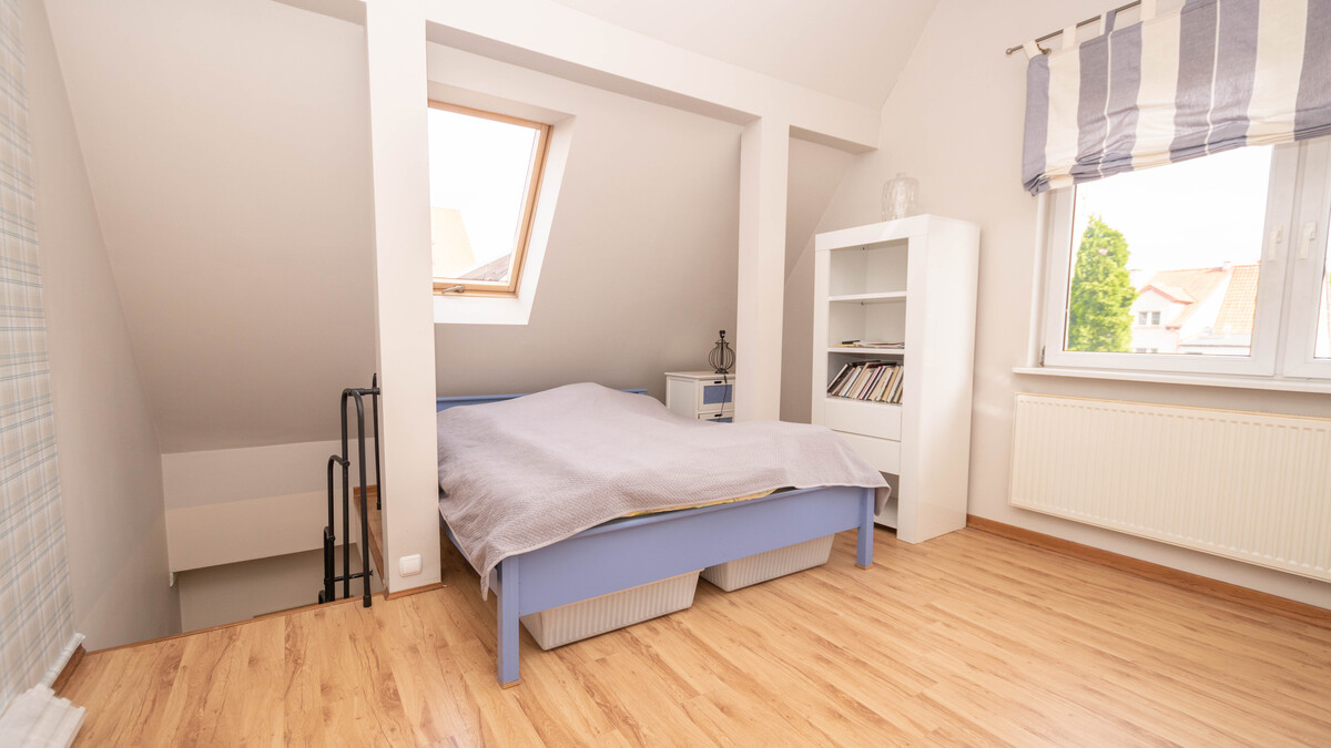 Na piętrze mieści się duża sypialnia z wygodną garderobą. Istnieje możliwość przywrócenia poprzedniego układu 4 pokoi.