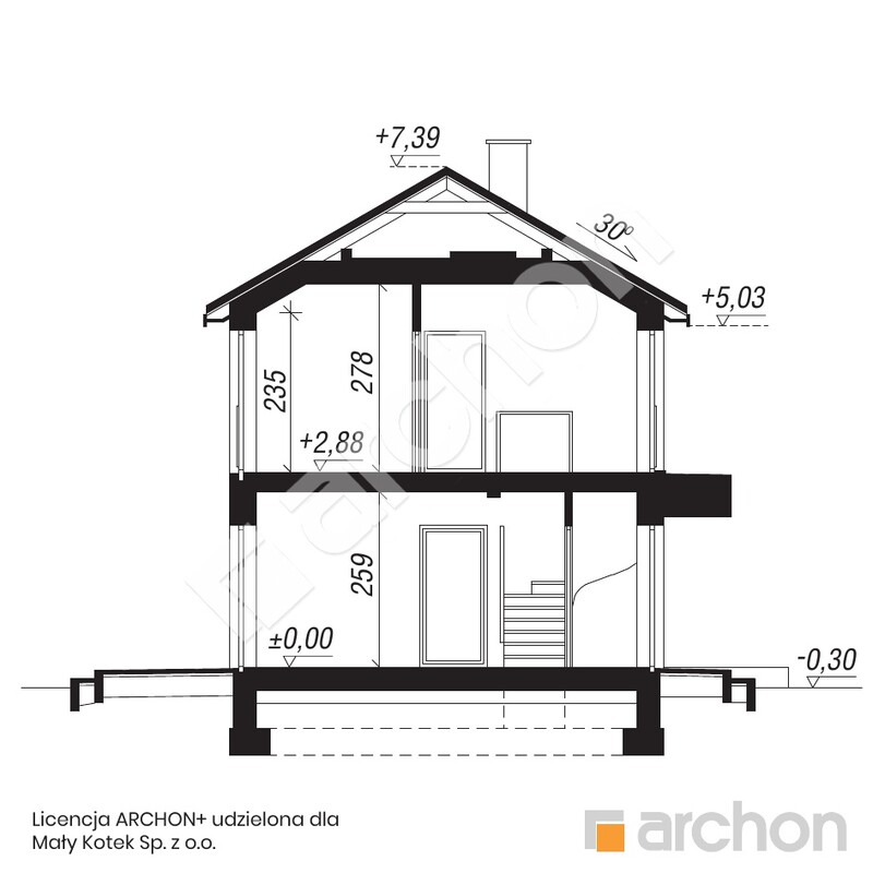 - Dach dwuspadowy: nachylenie 30° , pokrycie dachówka