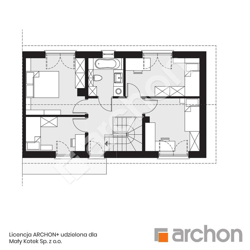 - Poddasze: schody, korytarz, łazienka, 4 pokoje