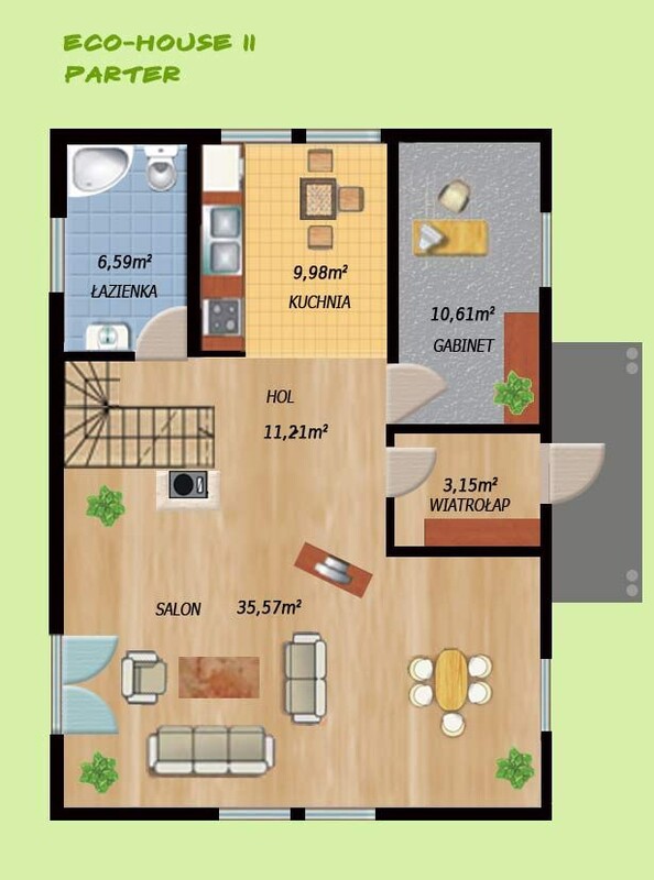 Na parterze znajduje się salon z kuchnią, gabinet i łazienka. Natomiast na poddaszu dom posiada 3 sypialnie oraz drugą łazienkę. Układ ścianek działowych, wewnętrznych jest dowolny. Duża ilość okien sprawia że do domu wpływa odpowiednia ilość promieni słonecznych