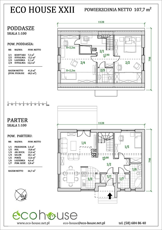 Dom drewniany Ecohouse XXII jest zgrabnym i przytulnym domem całorocznym o wymiarach 7,9 x 11,2m i powierzchni użytkowej 107,7m2.
