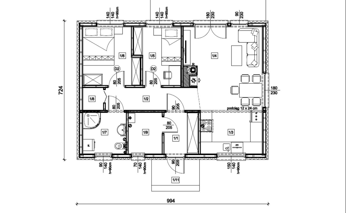 Na parterze znajduje się salon z kuchnią, 2 sypialnie, łazienka i pom. gospodarcze. Układ ścianek działowych, wewnętrznych jest dowolny. Duża ilość okien sprawia że do domu wpływa odpowiednia ilość promieni słonecznych