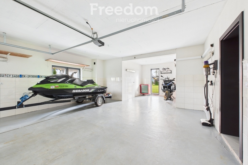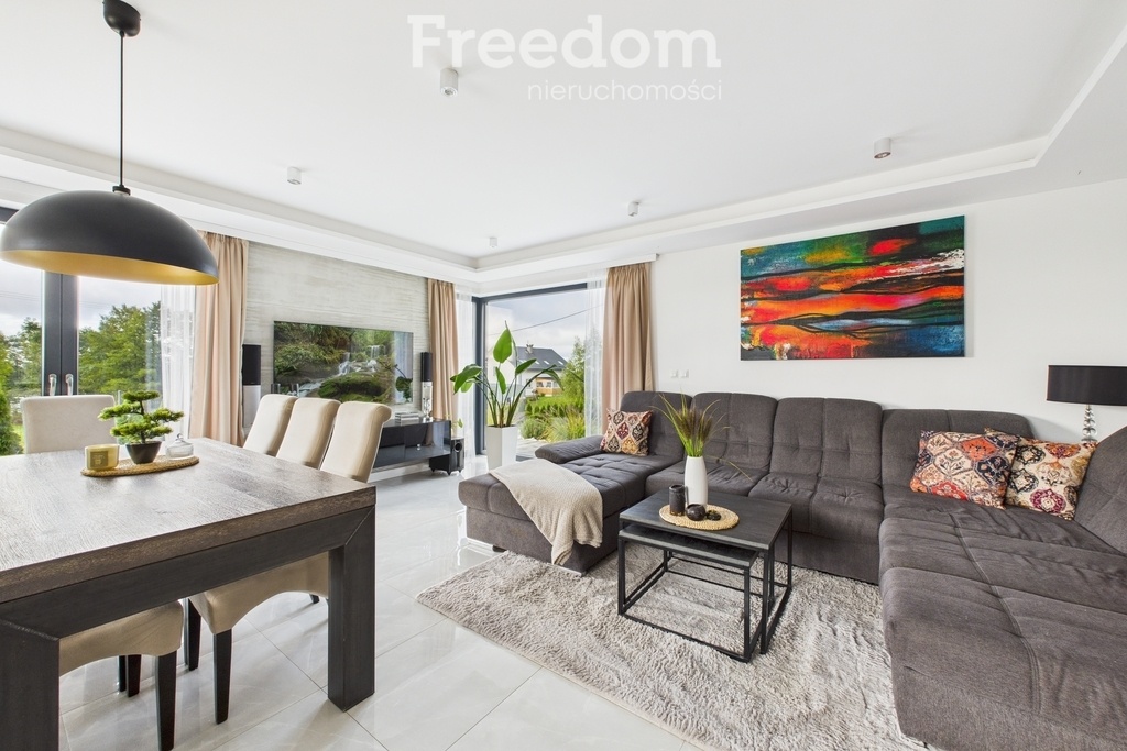 Wchodząc do budynku znajdujemy się w obszernym wiatrołapie, cały parter domu to część dzienna pięknie doświetlony salon z oknami z trzech stron świata i wyjściem na duży taras i bezpośrednio do ogrodu. Duży aneks kuchenny z wyspą na której znajduje się płyta grzewcza. Doskonale dobrana stała zabudowa kuchni wraz ze sprzętem agd: okap, duża lodówka, piekarnik, zmywarka. Zaraz przy kuchni bardzo przydatna spiżarnia. Na parterze znajduje się również łazienka do użytku osób przebywających na parterze. Z przedpokoju prowadzi wejście do bardzo dużego garażu, mieszczący wszystkie pojazdy obecnych właścicieli. Wg pierwotnego projektu na parterze w garażu istnieje możliwość wykonania dodatkowego pokoju z wyjściem na taras.