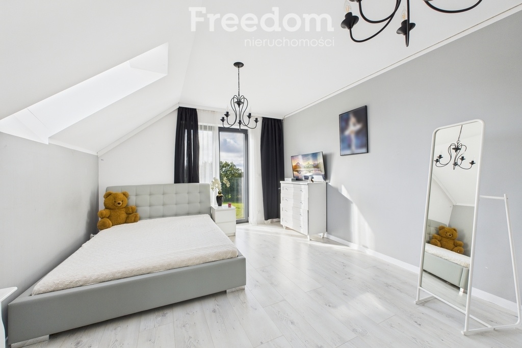 Piętro to kondygnacja sypialniana. Znajduje się tutaj pokój rodziców z własną garderobą i kabiną prysznicową. Dodatkowo trzy spore sypialnie z dużą i starannie wykończoną łazienką. Pomiędzy sypianiami znajduje się pomieszczenie gospodarcze - pralnia, niezbędne do funkcjonalnego użytkowania budynku.