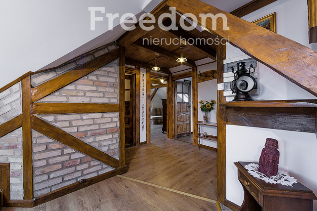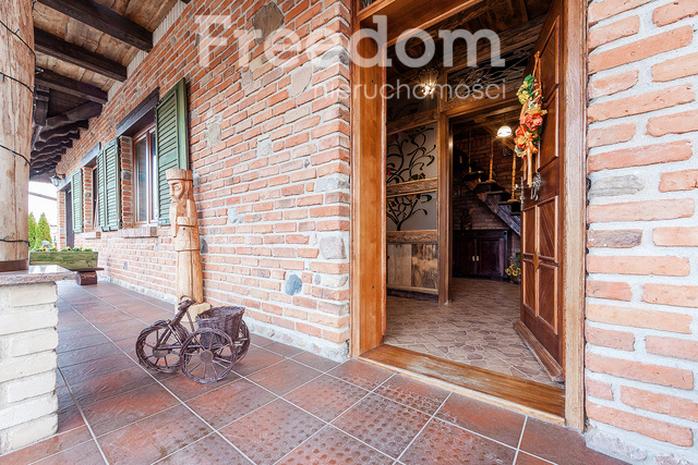 Brick, half-timbered walls, natural wood, and stone give the interiors a unique character. Respect for history and attention to every detail are evident – the house immediately evokes a sense of authenticity and harmony.