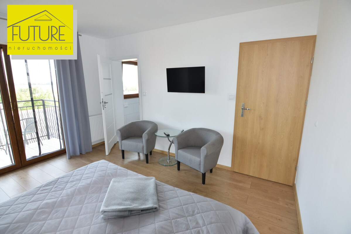 Na pierwszym piętrze są 2 pokoje z łazienkami, każdy pokój ma balkon. Pokoje są przystosowane pod wynajem, 1 mieszkanie dwu pokojowe z łazienką i kuchnią pow.35m2 z pełnym umeblowaniem i wyposażeniem.