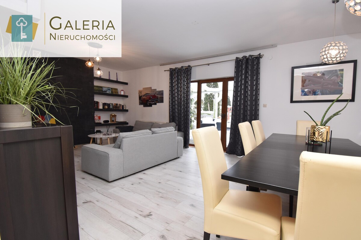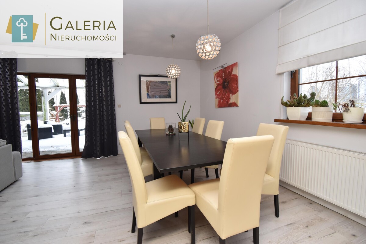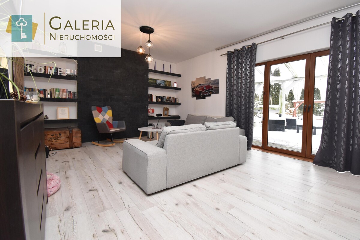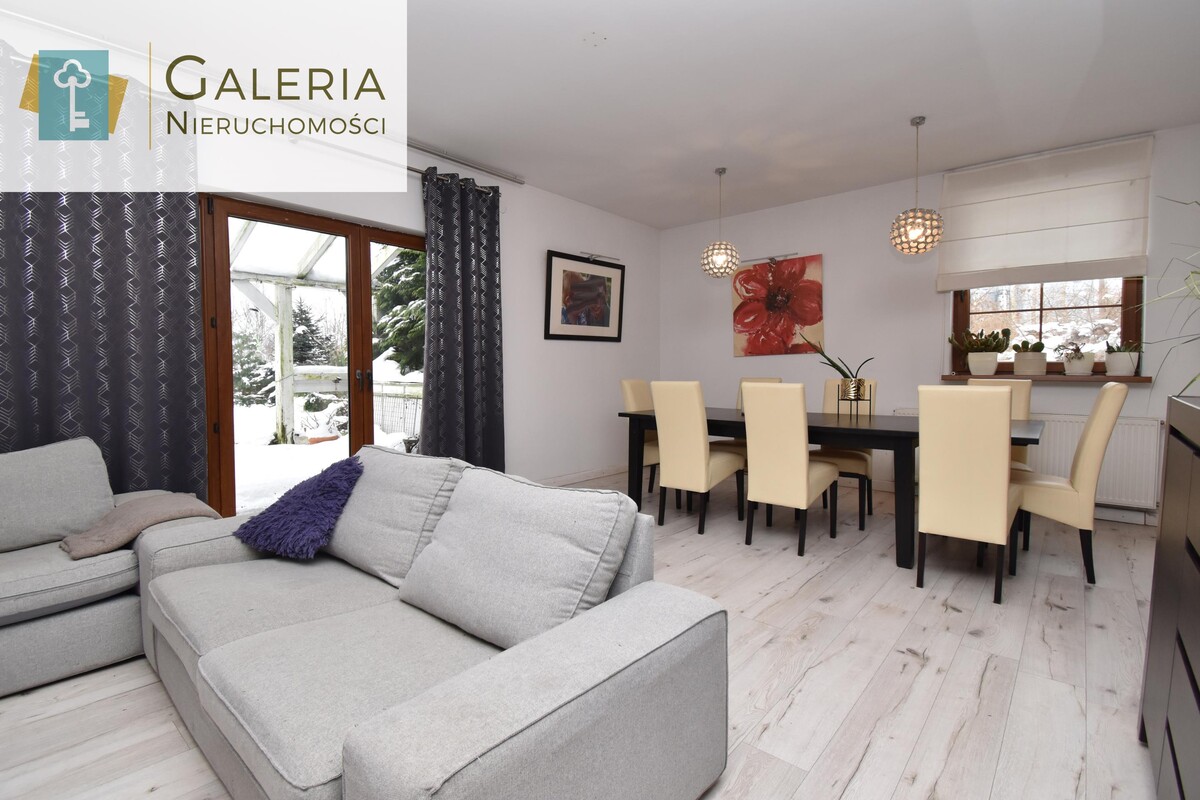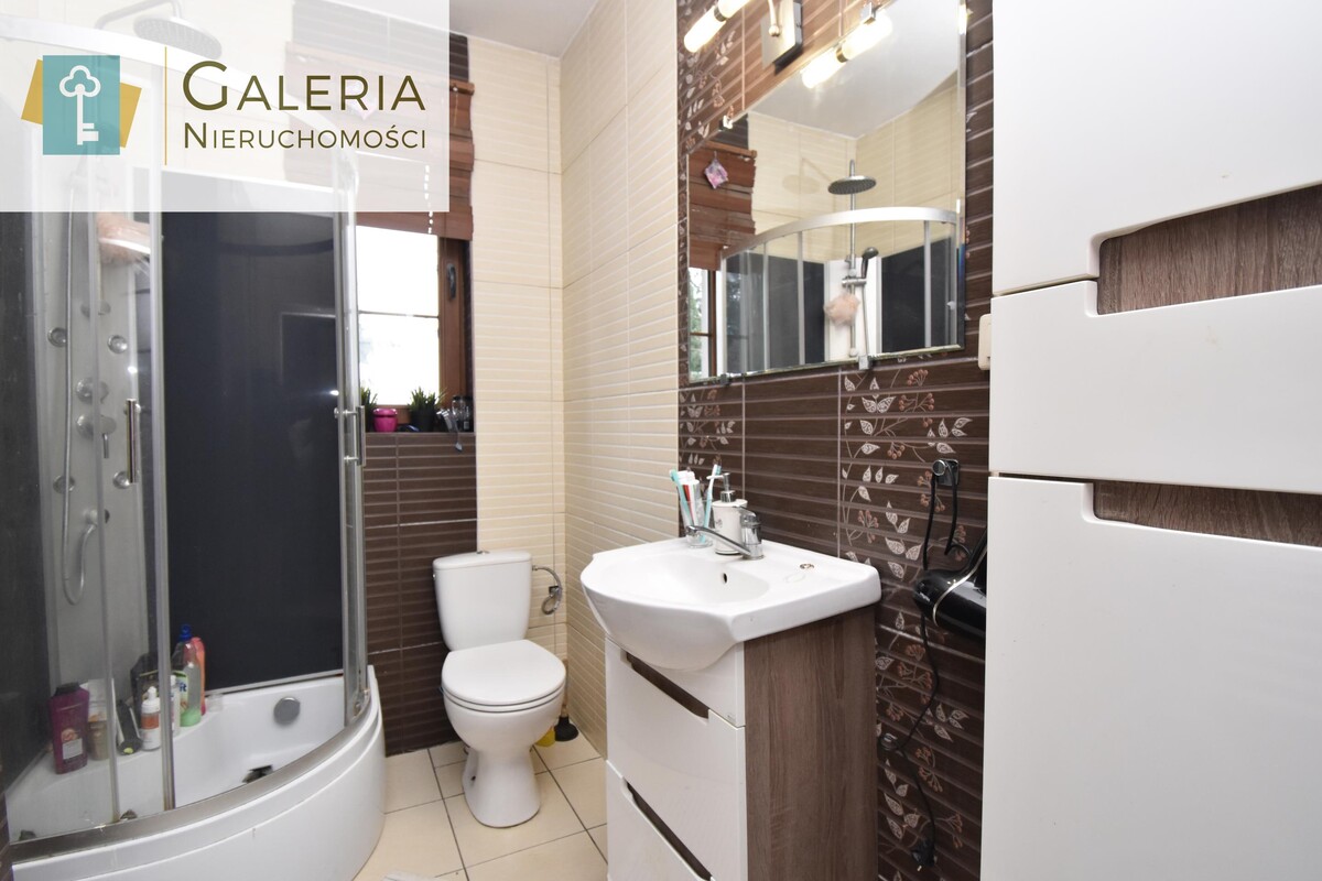 Z salonu prowadzi wyjście bezpośrednio do ogrodu. Na parterze znajduje się również łazienka wyposażona w kabinę prysznicową.