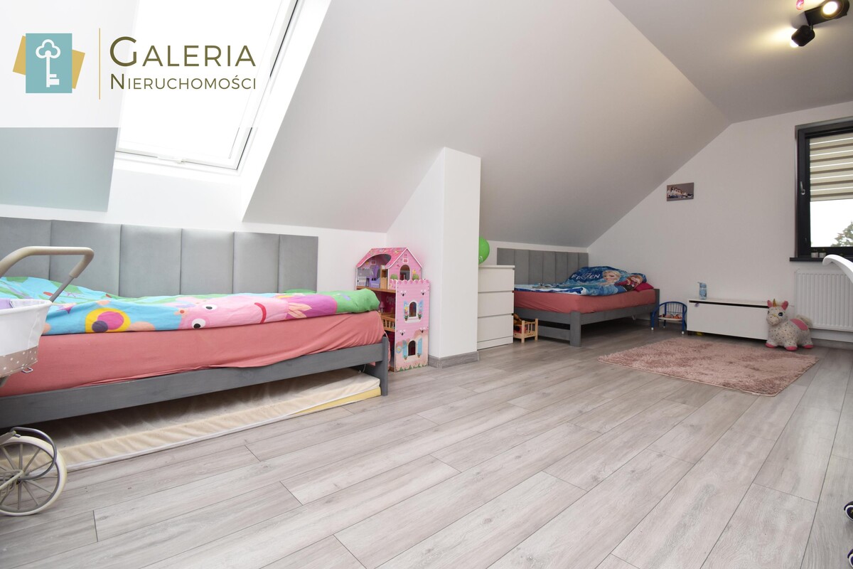 Na pierwszym piętrze są trzy sypialnie, łazienka z wc oraz przedpokój.