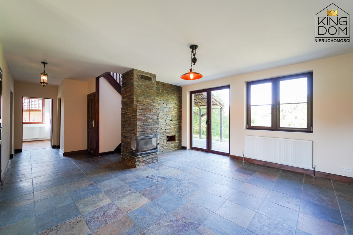 - przestronny salon z kominkiem i wyjściem na duży, częściowo zadaszony taras,