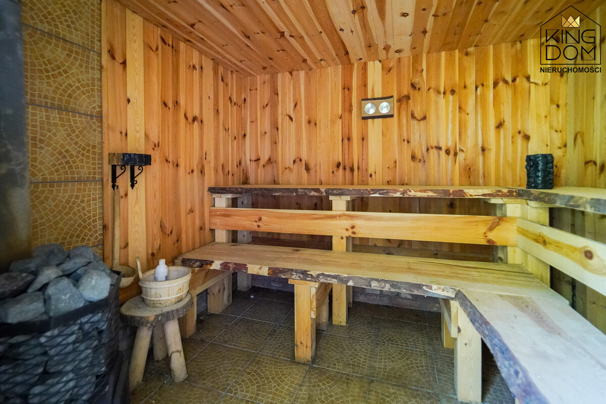 Na działce znajduje się również murowany budynek z sauną fińską, wyposażoną w kominek opalany drewnem i kamieniami do polewania i tworzenia pary wodnej, zapewniając idealne miejsce na relaks i regenerację sił w domowym zaciszu.