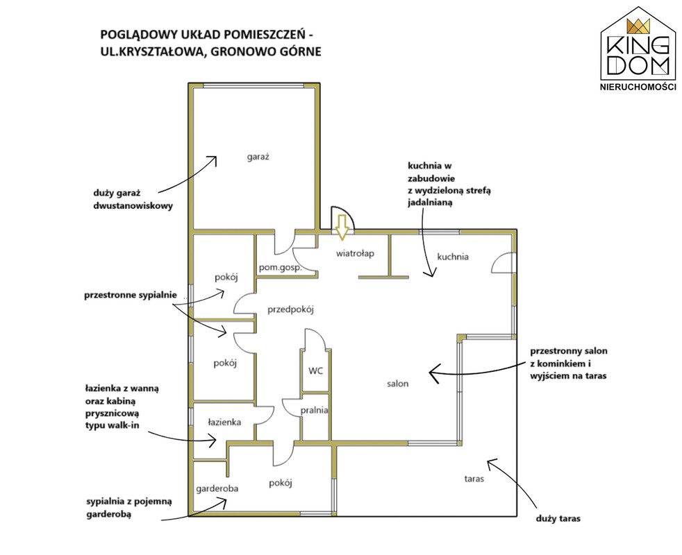 Kingdom Nieruchomości z przyjemnością przedstawia na sprzedaż nowoczesny dom wolnostojący – idealne połączenie komfortu, stylu i kontaktu z naturą, zlokalizowany na starannie zaprojektowanej działce w Gronowie Górnym. Dzięki usytuowaniu na lekkim wzniesieniu z tarasu roztacza się malowniczy widok na otaczającą zieleń.