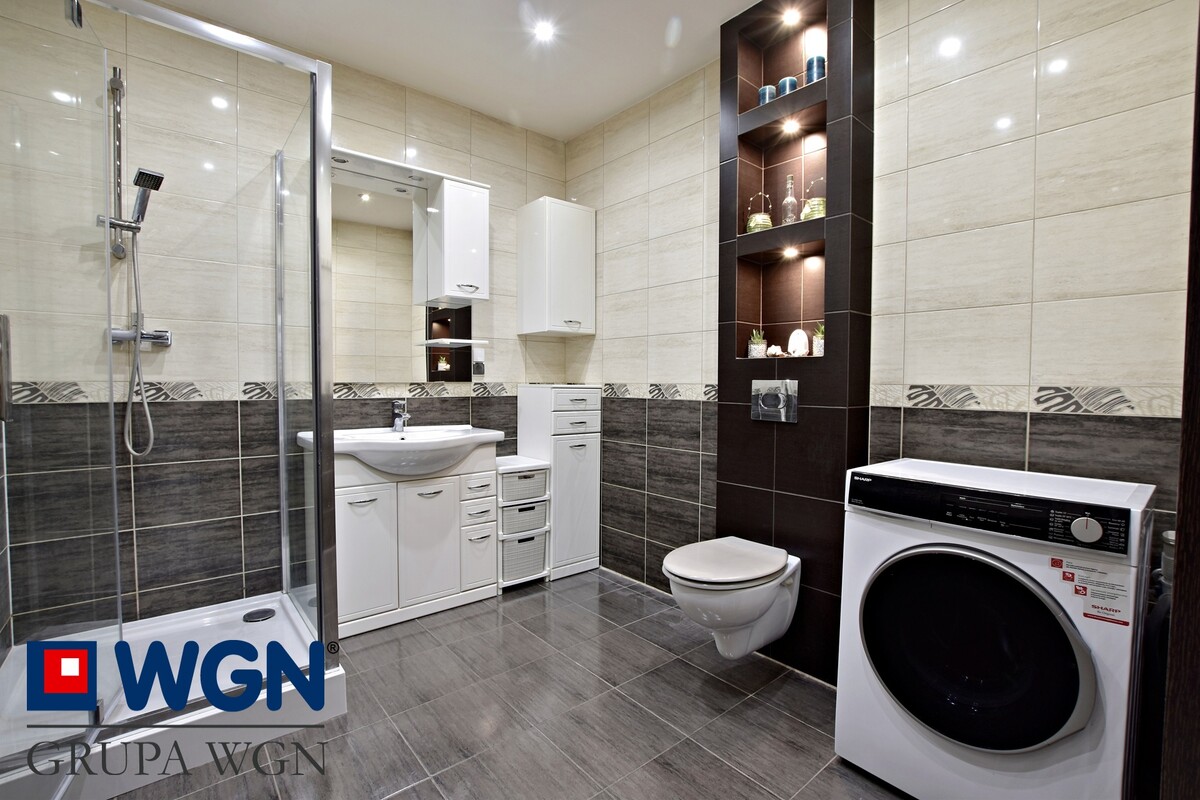 - łazienka z wc i kabiną prysznicową.
