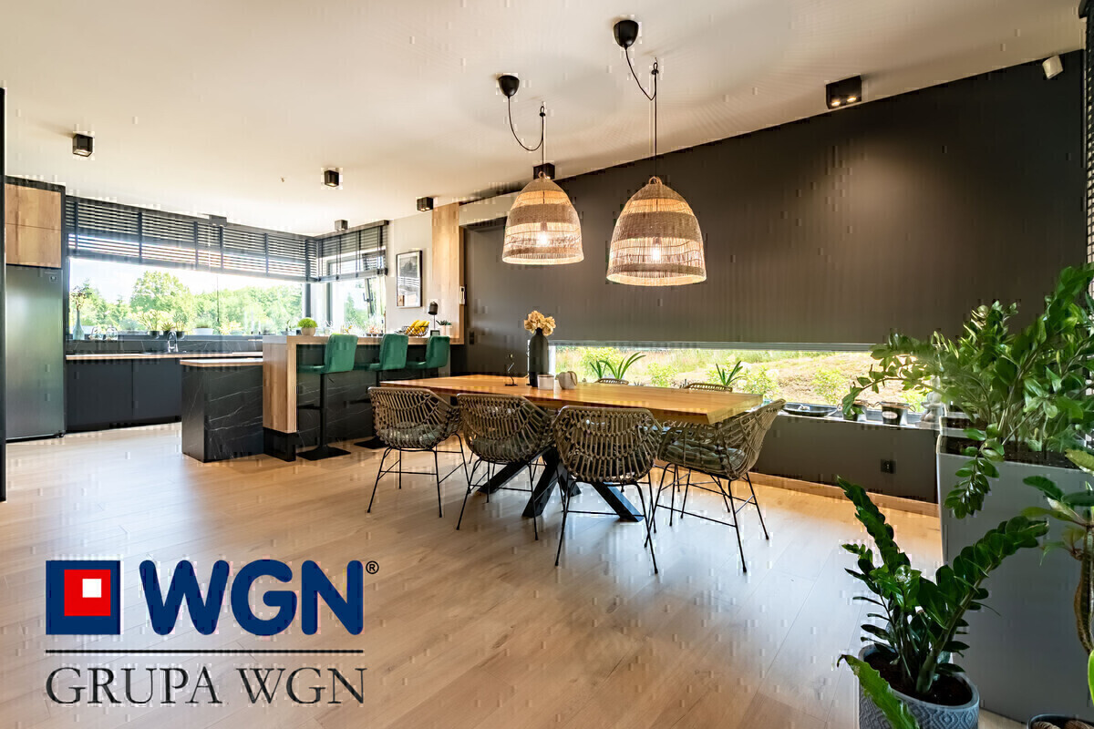 Ważną częścią nieruchomości jest przestronny salon z jadalnią i otwartą kuchnią o łącznej powierzchni ponad 54m2. Kuchnia w literę "U" z dużym blatem roboczym w kolorze dębowym, duże szafki i szuflady z miejscem do przechowywania oraz nowoczesnymi sprzętami AGD w kolorze czarnym w większości firmy Samsung, to tylko krótka charakterystyka tej kuchni. Kuchnia jasna, pełna światła dziennego dzięki dużym narożnym oknom, przez które możemy zobaczyć całość podjazdu oraz część ogrodu. Nowoczesne rolety w oknach przygotowane na wymiar, robią niesamowite wrażenie. Do tak pięknej kuchni, nie mogło zabraknąć równie pięknej jadalni, która składa się z dużego stołu z blatem drewnianym, przy którym każde spotkanie z bliskimi, czy rodzinne śniadanie będzie niezapomniane. W salonie znajduje się klimatyzacja oraz kominek, który z pewnością umili każdy wieczór. Salon z dużą narożną kanapą, to idealne miejsce do odpoczynku, przy dobrej książce, czy spędzając z rodziną przy ulubionym filmie. Ściana telewizyjna to kolejne akcenty przygotowane przez projektantkę, lamele, czarna ściana oraz duża szafka rtv, nawiązująca kolorystycznie do reszty mebli, to robi po prostu wrażenie i warto przyjść i poczuć ten klimat na żywo.
