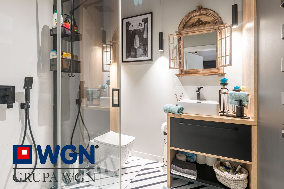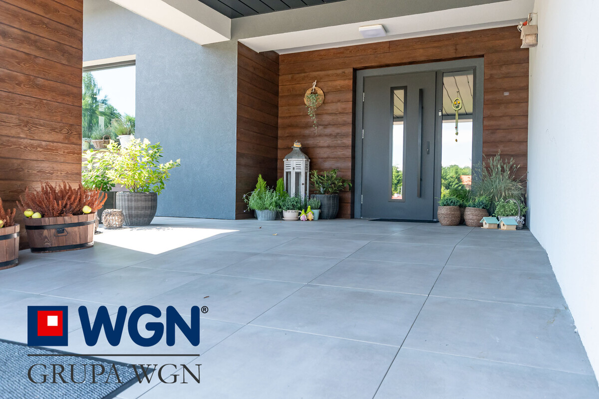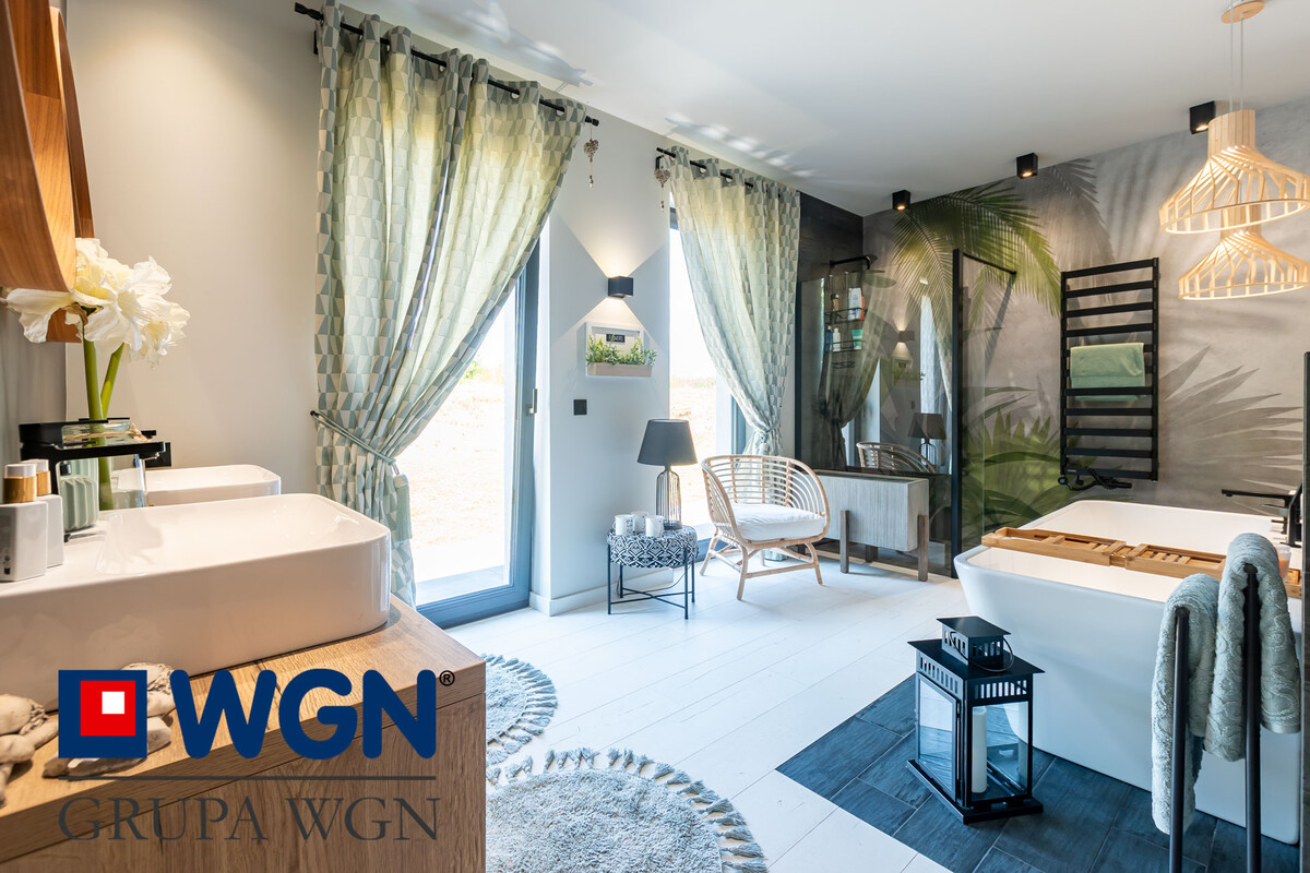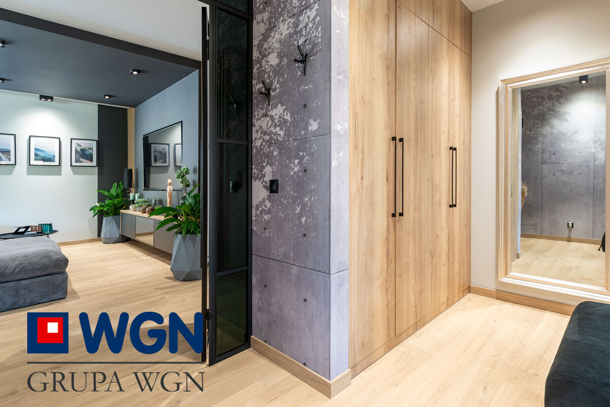 Nieruchomość zaaranżowana tak aby spełnić oczekiwania najbardziej wymagających klientów. Sam projekt przygotowany przez ML Studio Moniki Leszczyńskiej daje nam gwarancję idealnego wnętrza, pięknie przygotowanego, w nowoczesnych kolorach z użytymi materiałami wysokiej jakości. Przekraczając próg domu, już możemy zauważyć piękną tapetę oraz duże szklane drzwi w kolorze czarnym, które nam mówią że tu po prostu jest pięknie i nowocześnie.